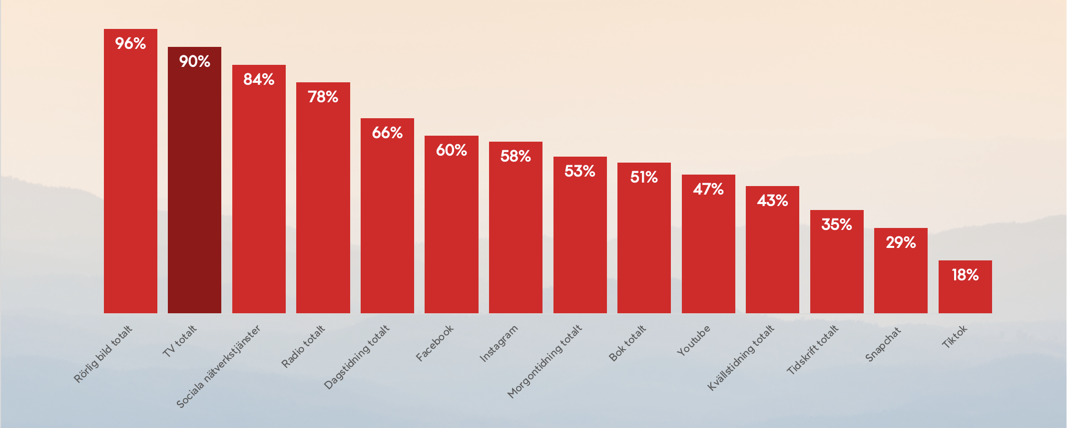 Tv totalt, linjärt plus online, har en daglig räckvidd bland Sveriges befolkning på 90 procent, vilket gör tv till det media som flest svenskar tar del av en genomsnittlig dag. Här nedan ser du den dagliga räckvidden fördelat på huvudmedie och mediebolag.